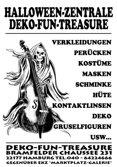 Strumpfhosen, Perücken, Schmuck, Schminke von Eulenspiegel, gruselige Kontaktlinsen, Latexmilch, Wunden, Teulfelshörner,Hexenbesen, Teufelsgabel etc.